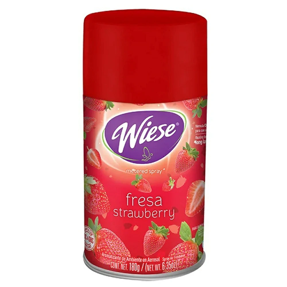 Repuesto de aerosol Wiese aroma Fresa 180 g, diseñado para usarse en dispensadores automáticos. Brinda un aroma frutal y dulce, ideal para mantener los espacios frescos y agradables.