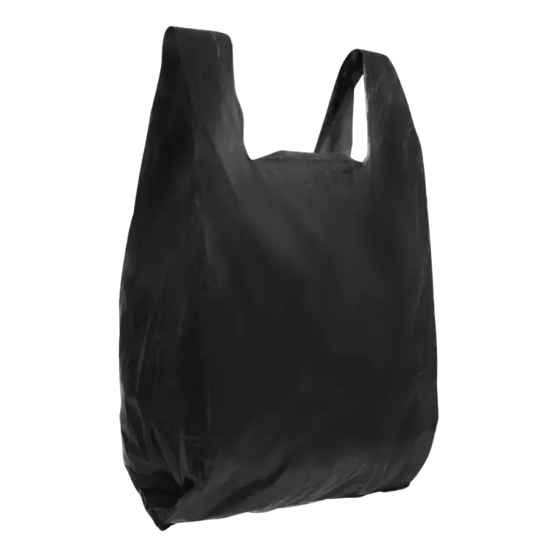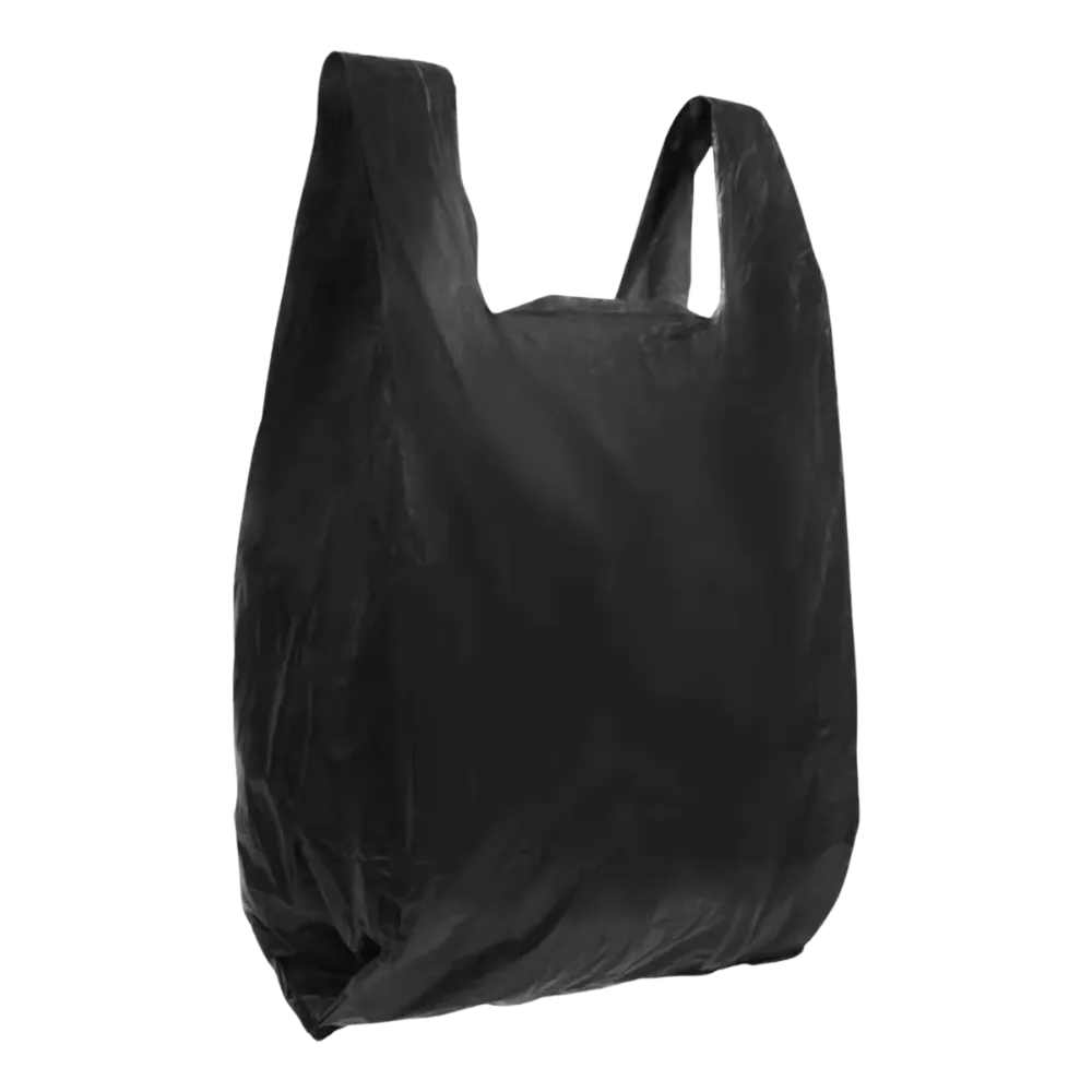 Bolsa tipo camiseta color negro, medidas 9″ x 5″ x 18″, fabricada en plástico resistente, ideal para empaque y transporte de productos en comercios, tiendas de conveniencia o para uso doméstico. Su diseño tipo camiseta ofrece facilidad de agarre y resistencia al peso moderado.