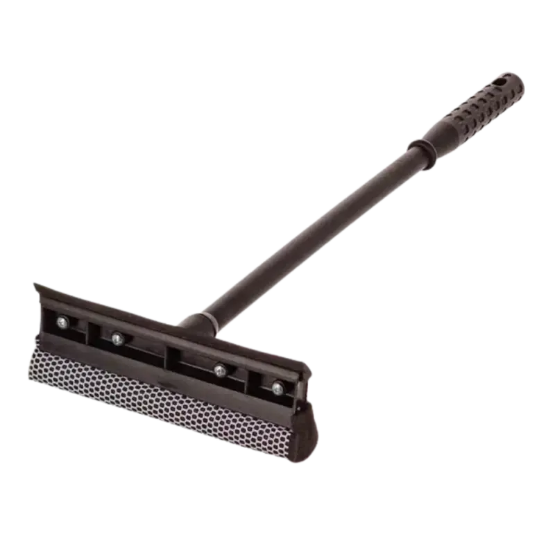 Escobilla de goma y fregadora en uno, depurador de malla de alta resistencia para la acumulación difícil de eliminar en las ventanas, Mango de plástico de 21” para un alcance extendido, escobilla de goma/fregadora de 8”