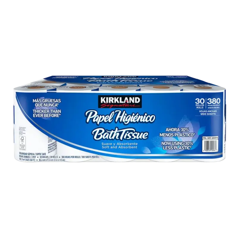 Disfruta de la suavidad y blancura con el papel higiénico Kirkland, que con su alto conteo de hojas largas y anchas rinde para toda tu familia, al mismo tiempo que la proteges contra polvo y humedad.