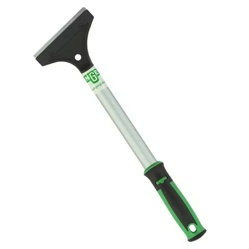 Raspador de superficie resistente con agarre ergonómico. Mango resistente de 12” para mayor poder de limpieza. Hoja reversible de acero al carbono con filo afilado para raspar pintura y cinta, y filo romo para cemento y estuco. Viene con tapa protectora para la cuchilla.