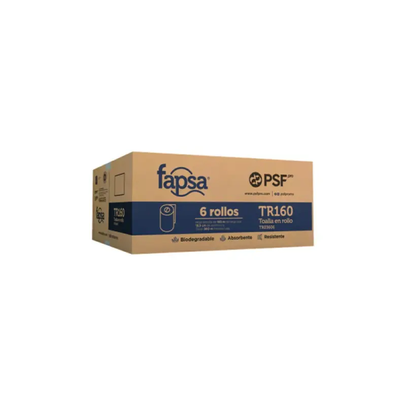 Papel hoja sencilla, rollo de 160 metros. Presentación en caja con 6 piezas.