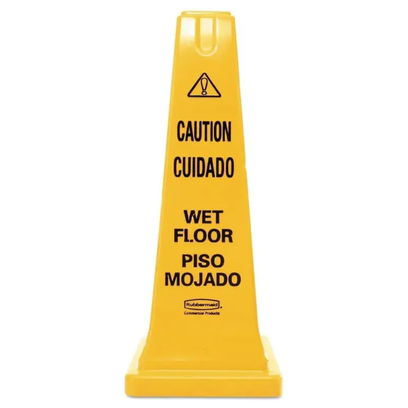 Cono de protección contra riesgos de 36″, de color amarillo brillante y muy visible. La comunicación de seguridad multilingüe utiliza colores que cumplen con las normas ANSI/OSHA.